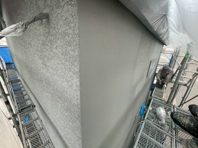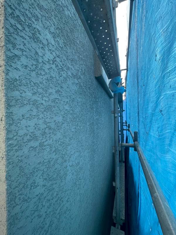 足場を解体する前の作業風景ですが。、塗装屋さんがジョリパットを仕上げています😊