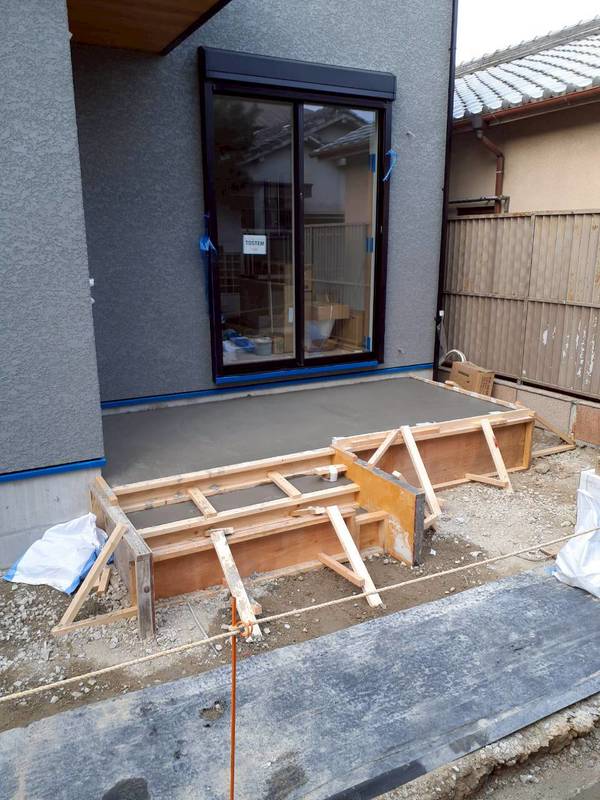 足場が解体されたのでタイル屋さんが入る前にポーチ階段の下地を施工している所です❕