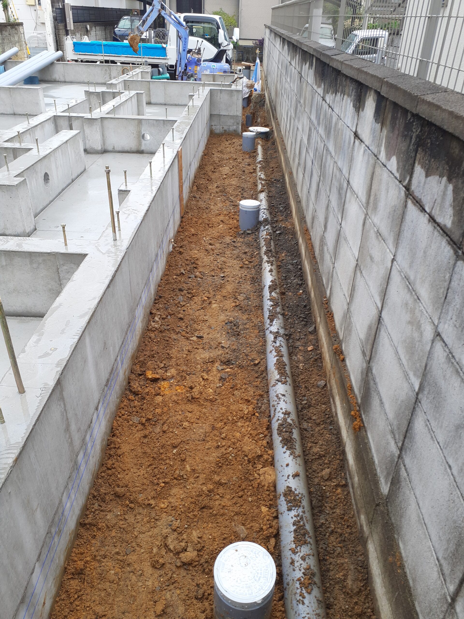 基礎工事が終れば、外部周りに雨水や排水の配管を設備屋さんが設置します。