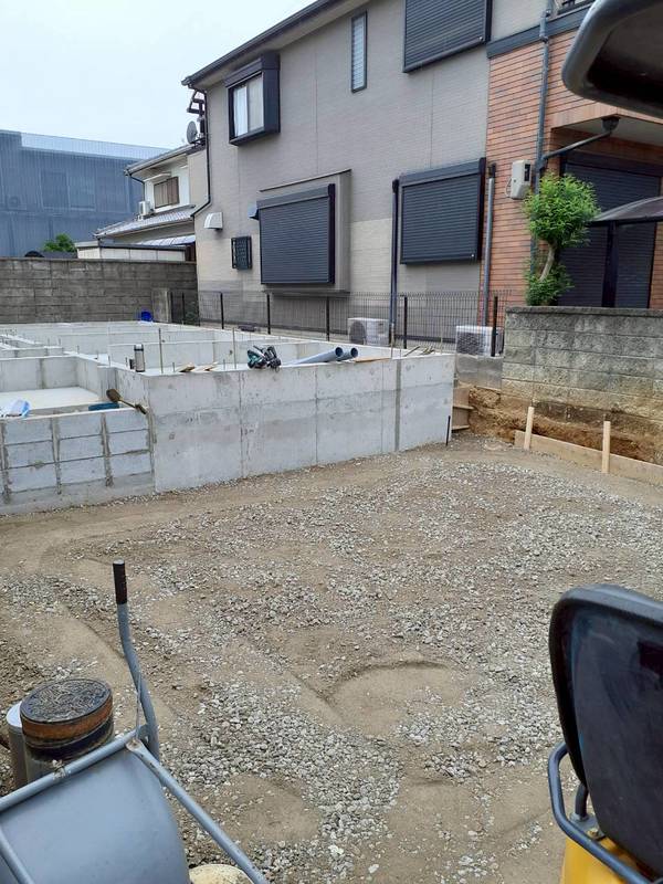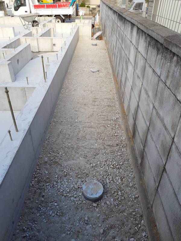 犬走部分も、設備屋さんが外部排管を設置するのに掘削しているので、全面と同じ内容で砕石を入れて転圧していきます。