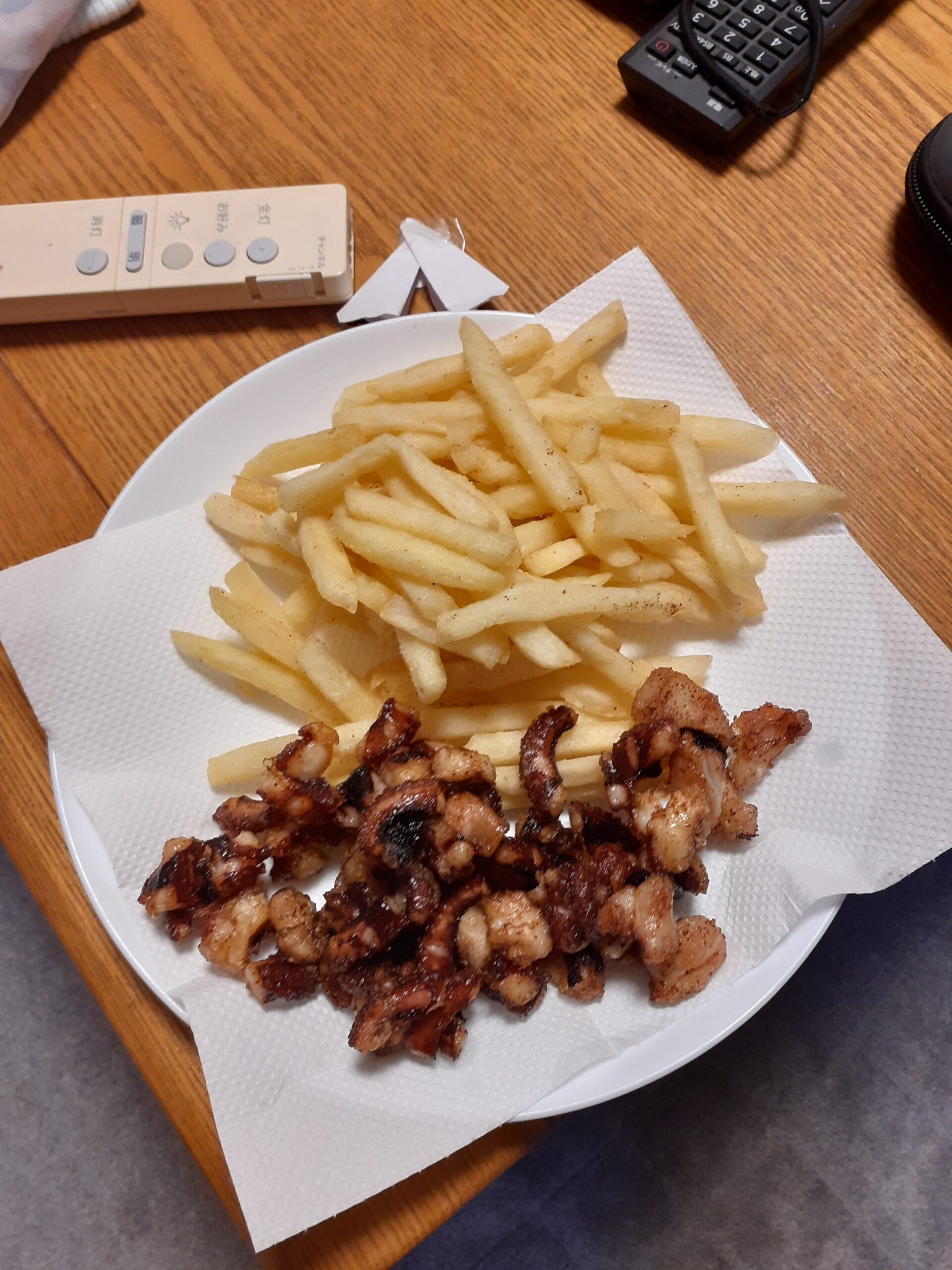 PS.僕の報告(釣果)は段取りが悪くお伝えする事が無いので、夏に釣ったタコのから揚げでもご報告させて頂きますね😊(ちなみにポテトフライは業務スーパーです💦)
