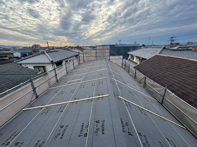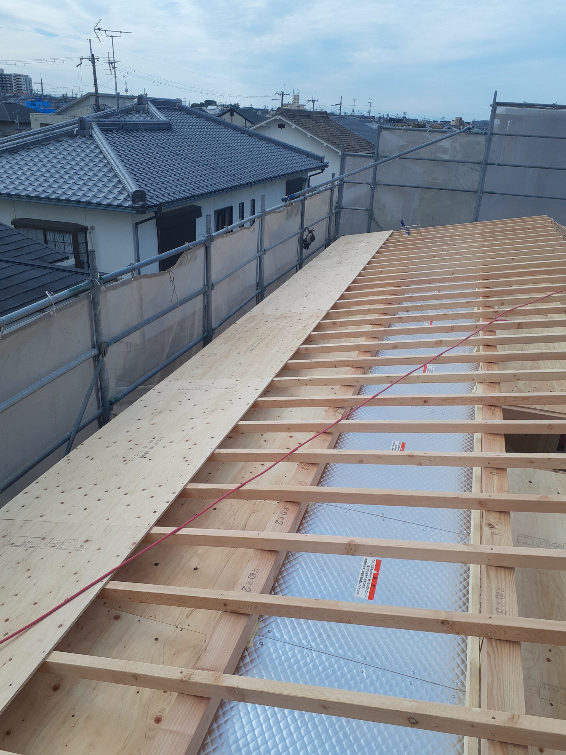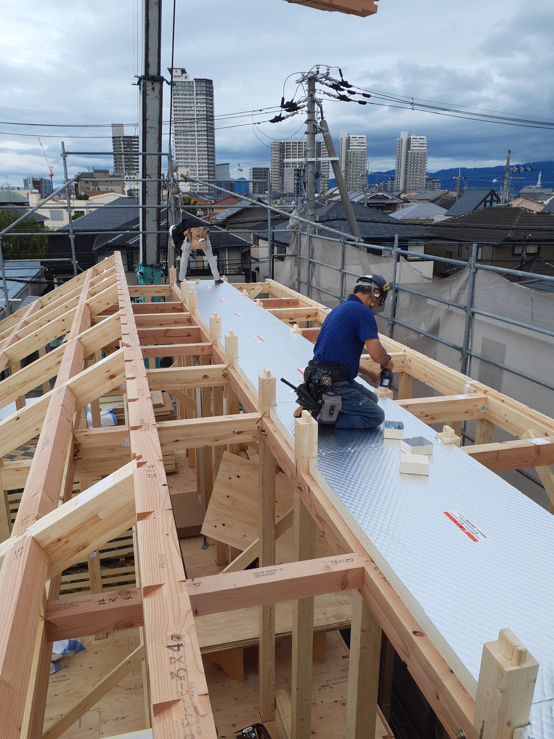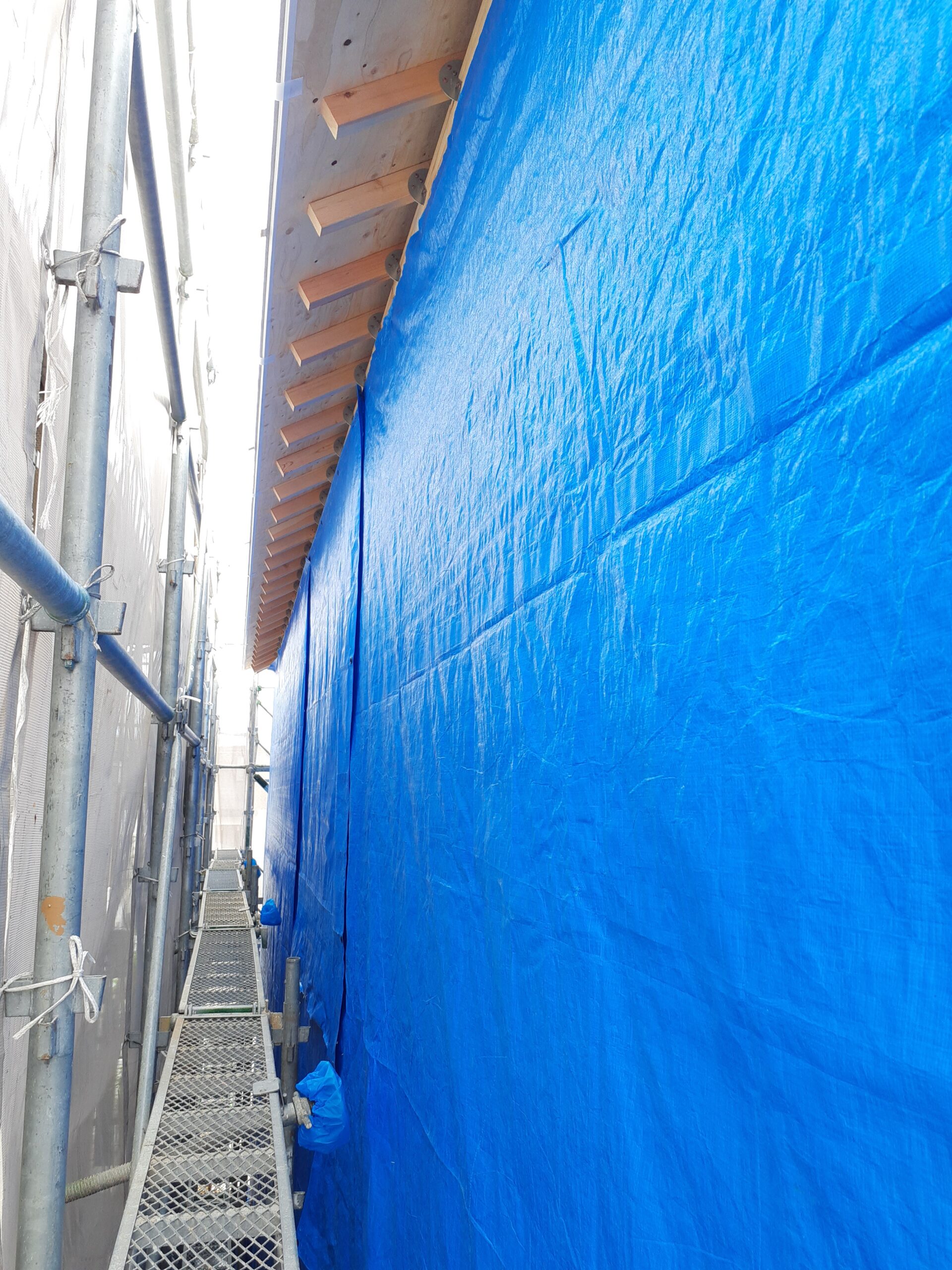 2日目に大工さんが屋根を終わらして、屋根にルーフィング、外回り全面にブルーシートで雨養生をします。