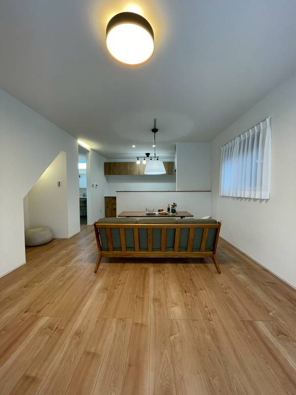 木目調のキッチンや家具がオシャレで、階段下ヌックも落ち着いた隠れ家のようで素敵なリビングルームですね😊😊
