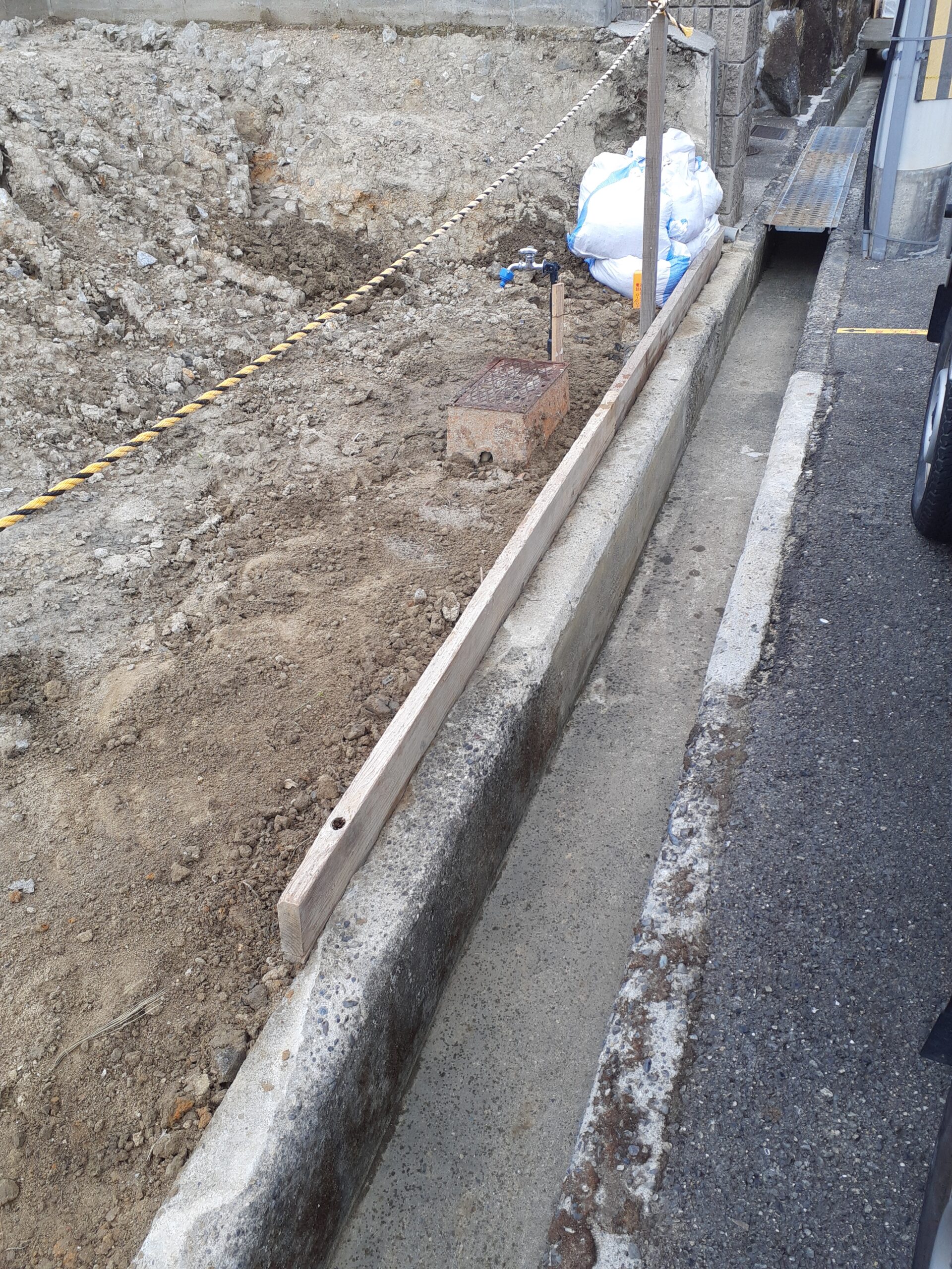 最近雨が多いので、敷地の土が溝に落ちないように足場板で土留めをしてきました。
