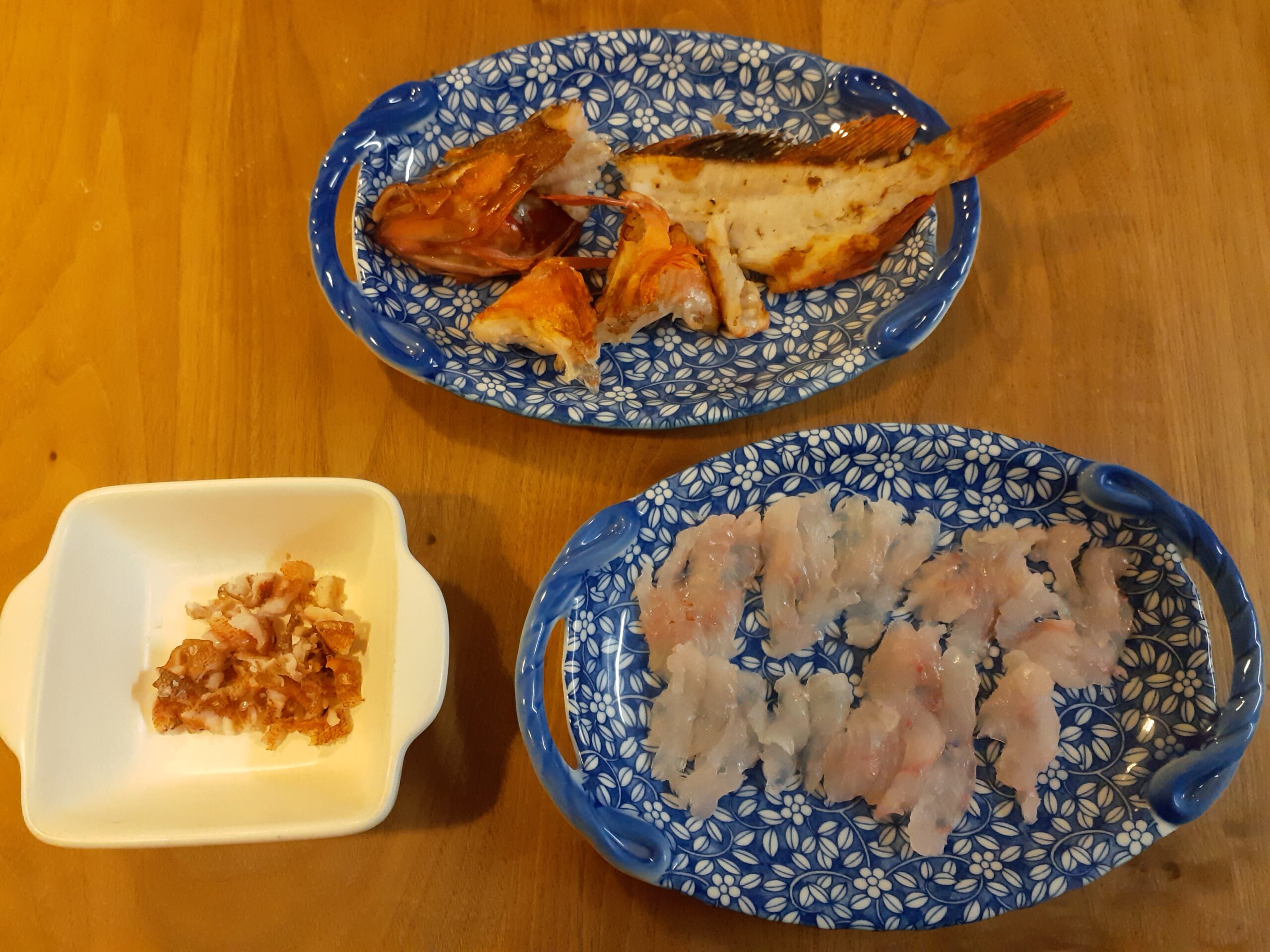 刺身、皮のポン酢和え、あらの塩焼きです😊😊