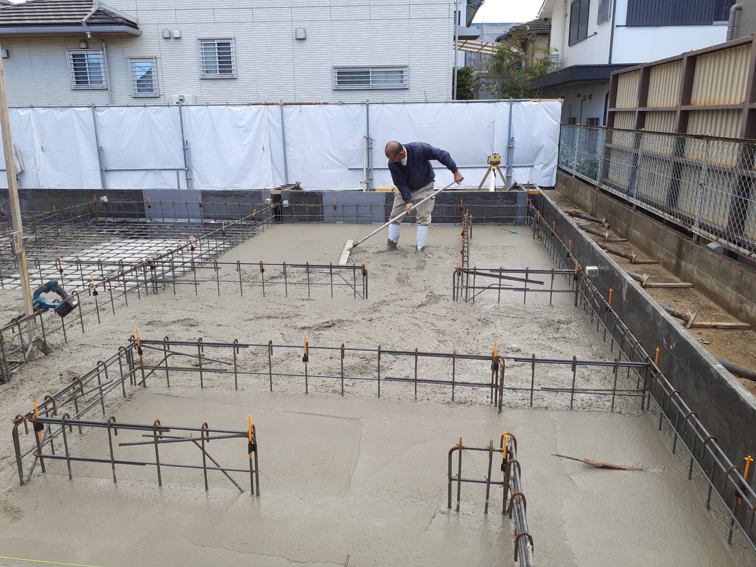 ポンプから送られてくる生コンを、職人さんがレーザーレベルで高さを見ながらバイブレータをかけて流していきます。