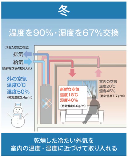例えば、冬場の外気が0℃であれば換気システムを通して18℃の新鮮な空気として取り込みます。