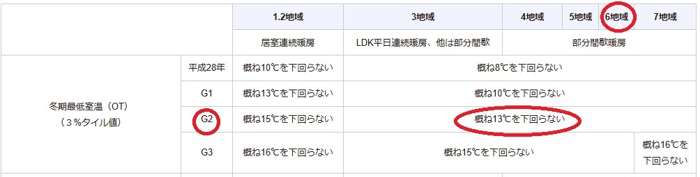 以下の表のようにG2グレードは大阪や東京(6地域)では最低室温をおおむね13℃以上を確保している事と決められています