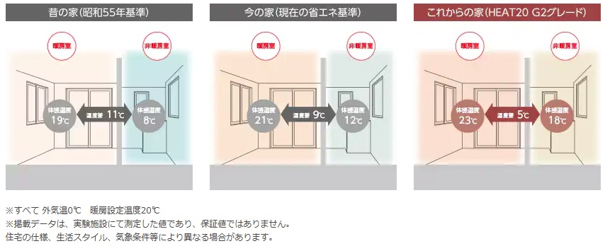 建物の断熱性能を高めると、家の中の部屋ごとの温度差が少なくなります