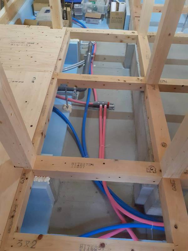 内装工事は床下塗装が終りましたので、設備屋さんが床下の内部配管を施工されています。