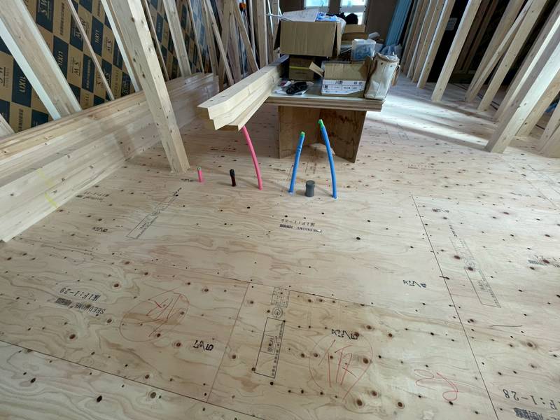 床下配管工事が終れば大工さんが床板を綺麗に貼っていきます。