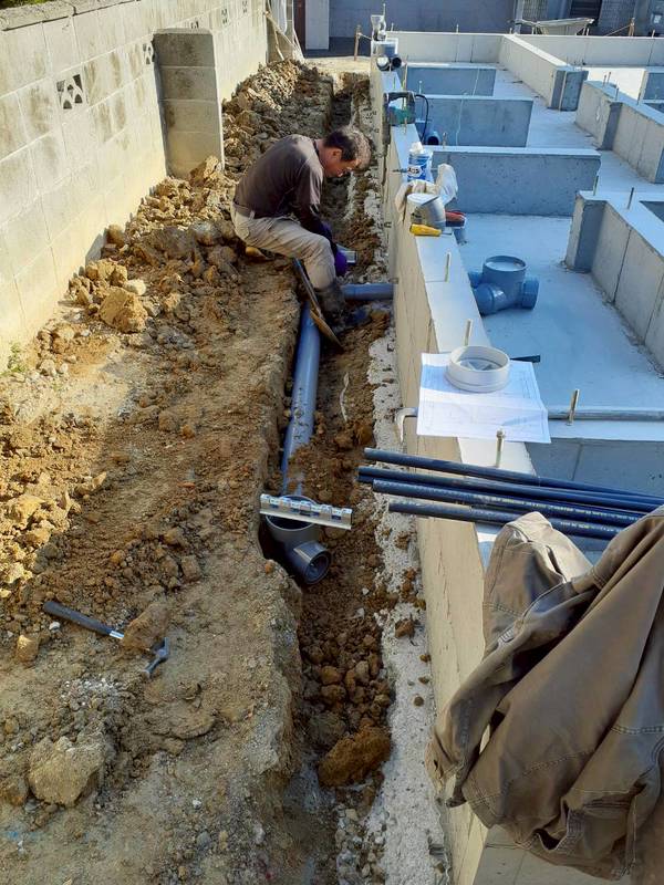 基礎工事が終れば足場を組む前に設備屋さんが外部排管の施工をしていきます。