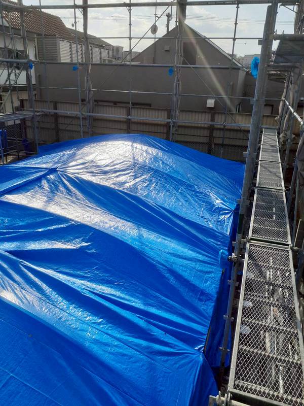 土台敷きが終れば次は上棟になるのですが、その間に雨が降って材料を濡らしたくないので雨養生をしていきます。
