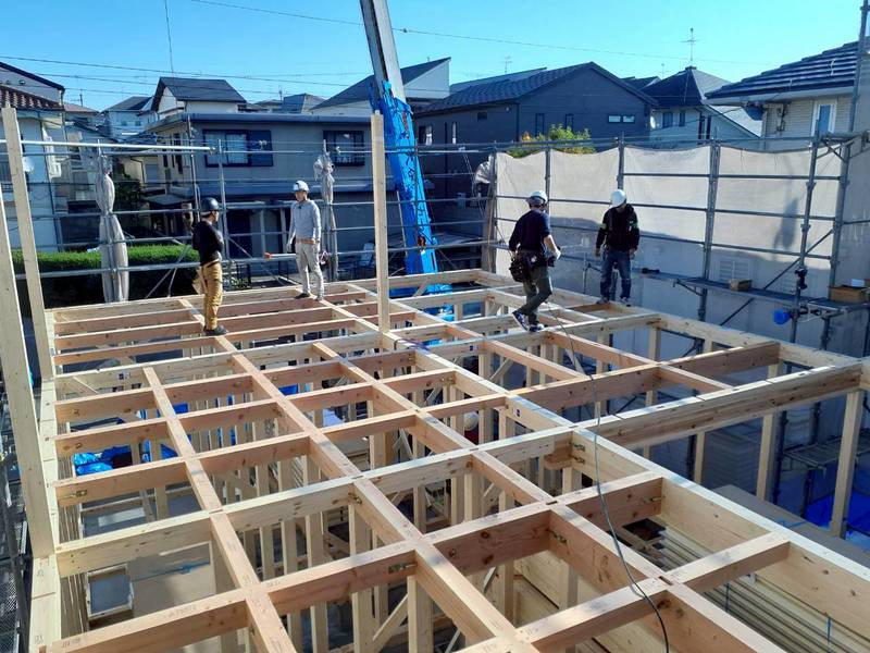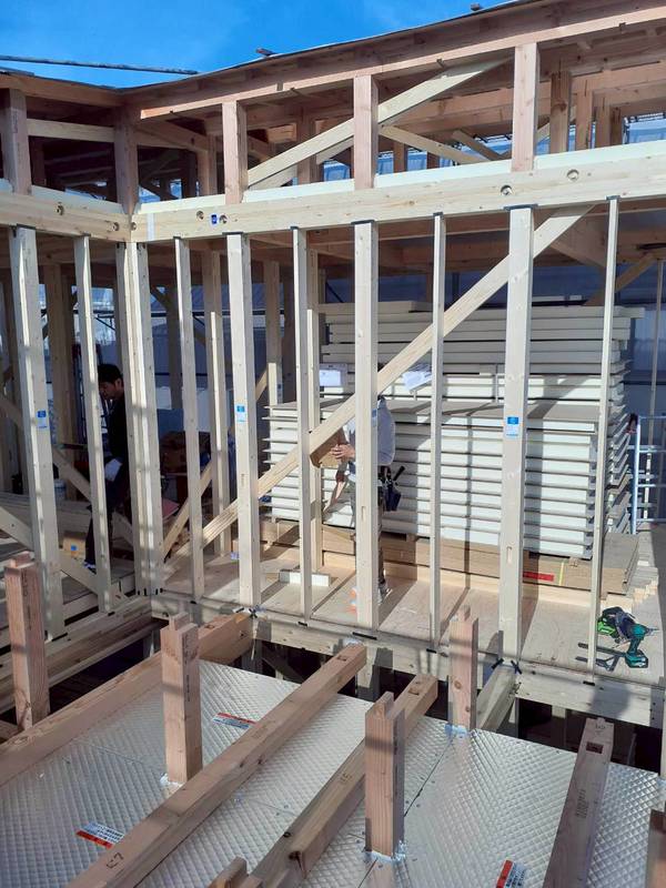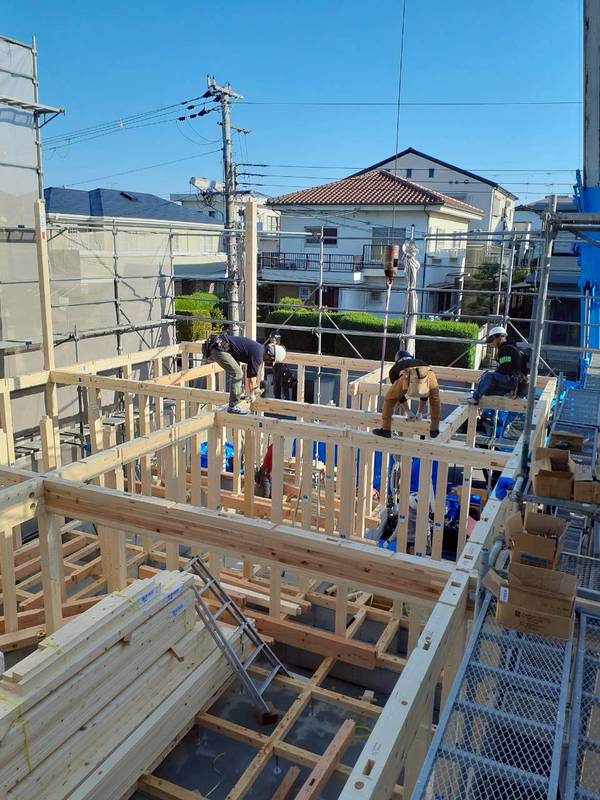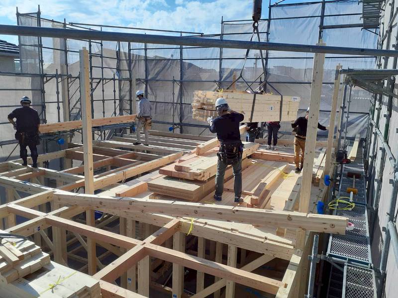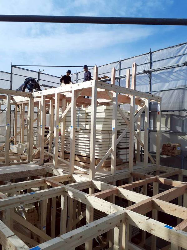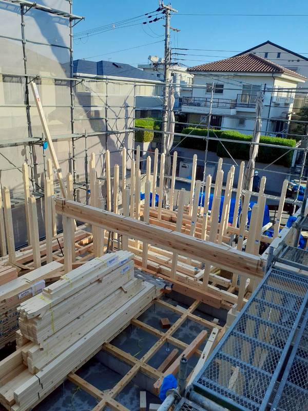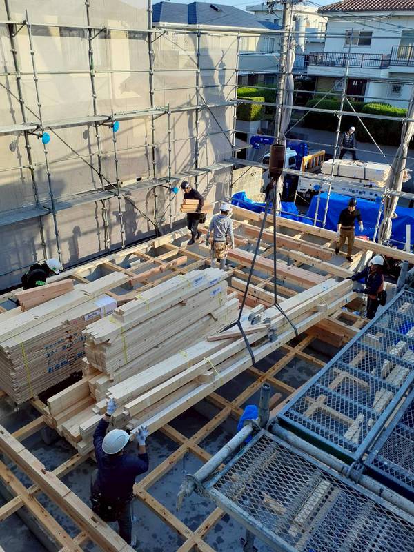 床板を貼り終われば一階と同じで、材料搬入→柱を建てる→梁を組むの作業になります。