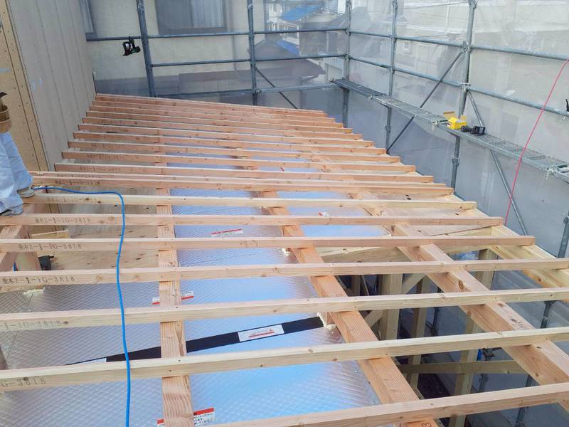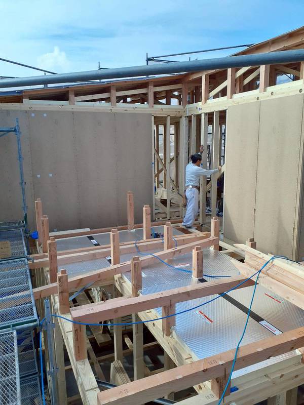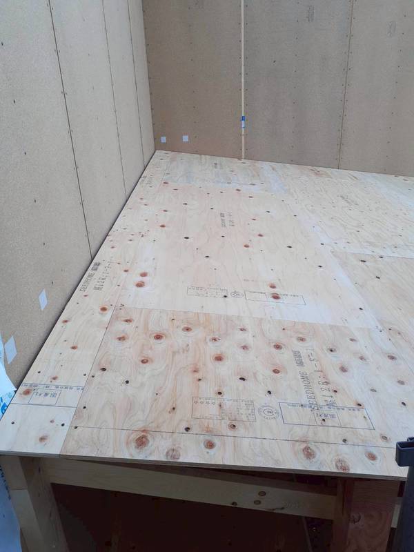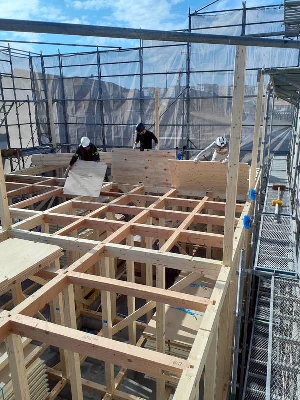 建ち(垂直)が確認出来たら2階床を貼っていきます。