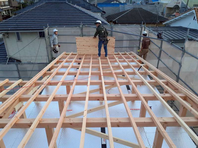 家の形で進み方は変わりますが、K様邸は下屋根が大きかったので大屋根までの完了が一日目、二日目に下屋根が完了といった工程になりました。