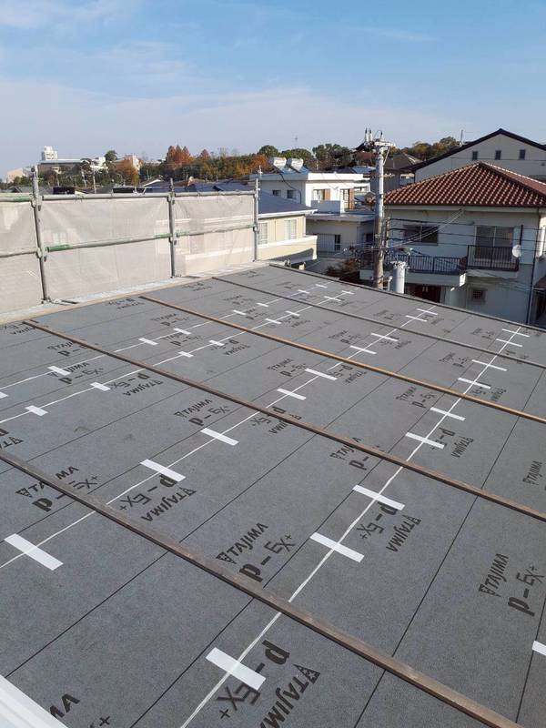 屋根板の上にルーフィングを貼れば一日目が終了です。