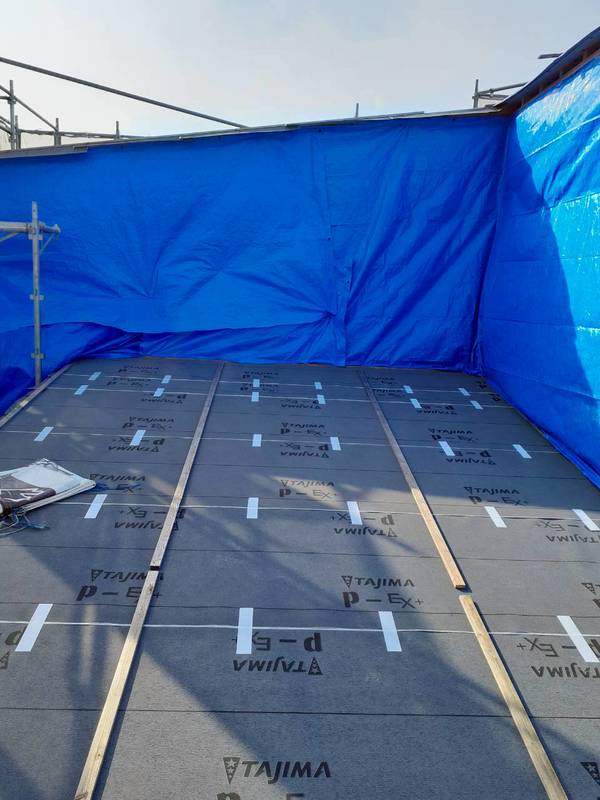 後は屋根にルーフィングを貼り、全面をブルーシートで囲えば二日間の上棟が終了です。