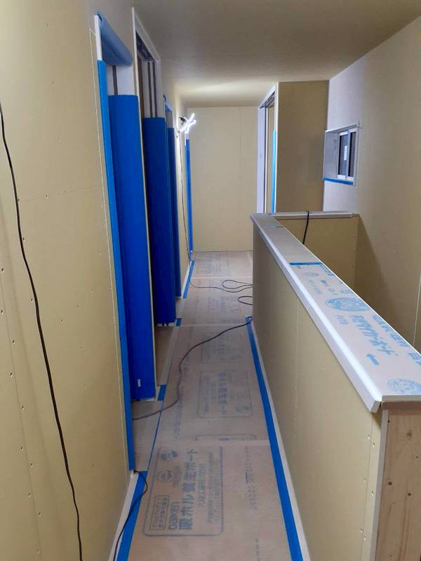 ドア枠周りも綺麗に石膏ボードが貼り終わって養生も完璧ですね✨