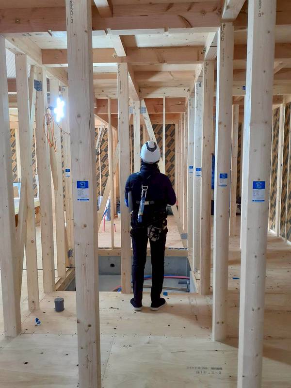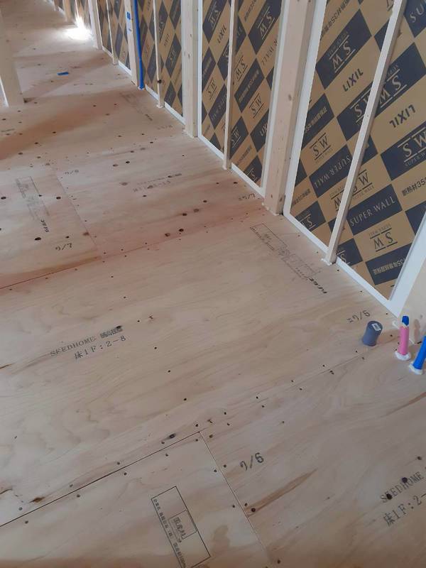 大工さんが1階の床板を貼り終わりました。