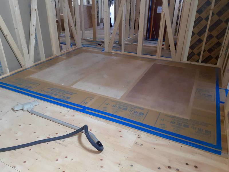 仕上がった床の上で作業する場所は、養生の上にベニヤ板を敷きます。