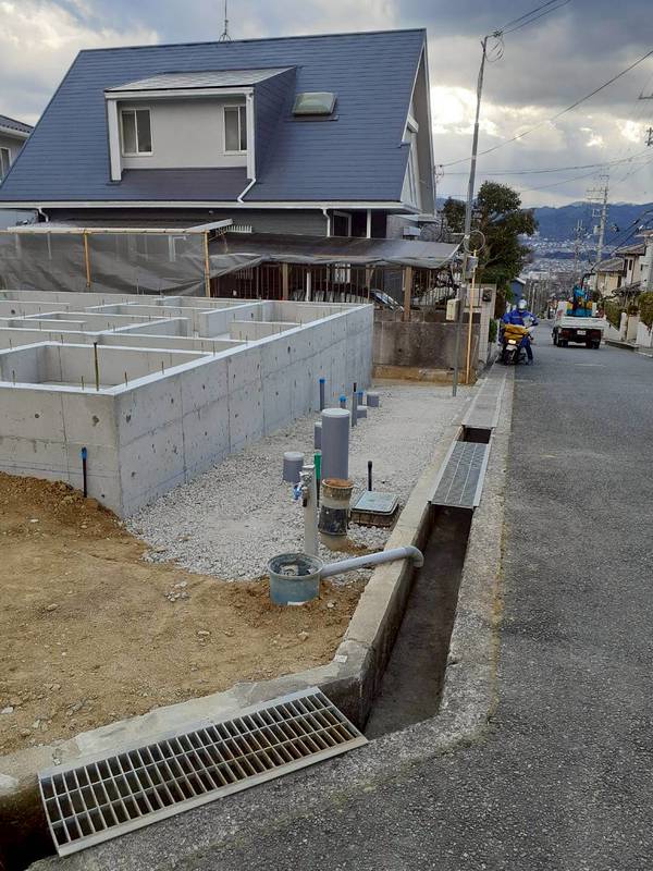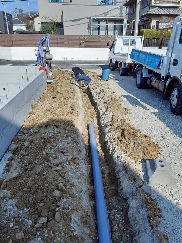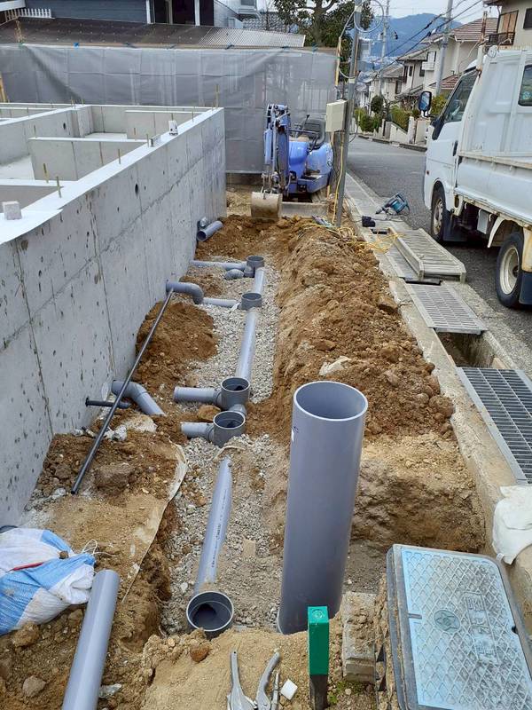 基礎工事が完了したので設備屋さんが屋外給排水の配管工事を行います。