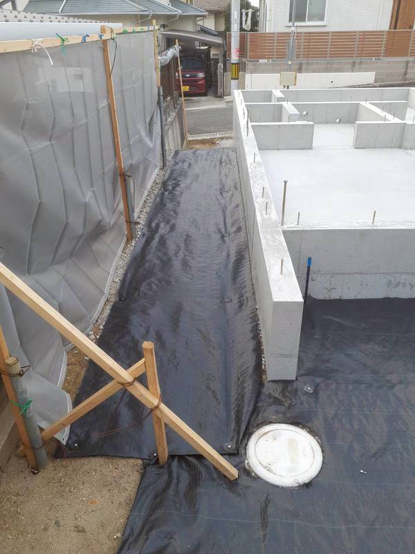 綺麗に整地が終れば防草シートを敷いて、足場を建てていよいよ大工さんの工事が始まります。