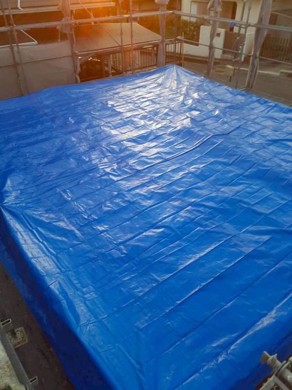 次の日は晴れ予報での上棟ですが、夜露が下りるので全面シート掛けをして養生です。