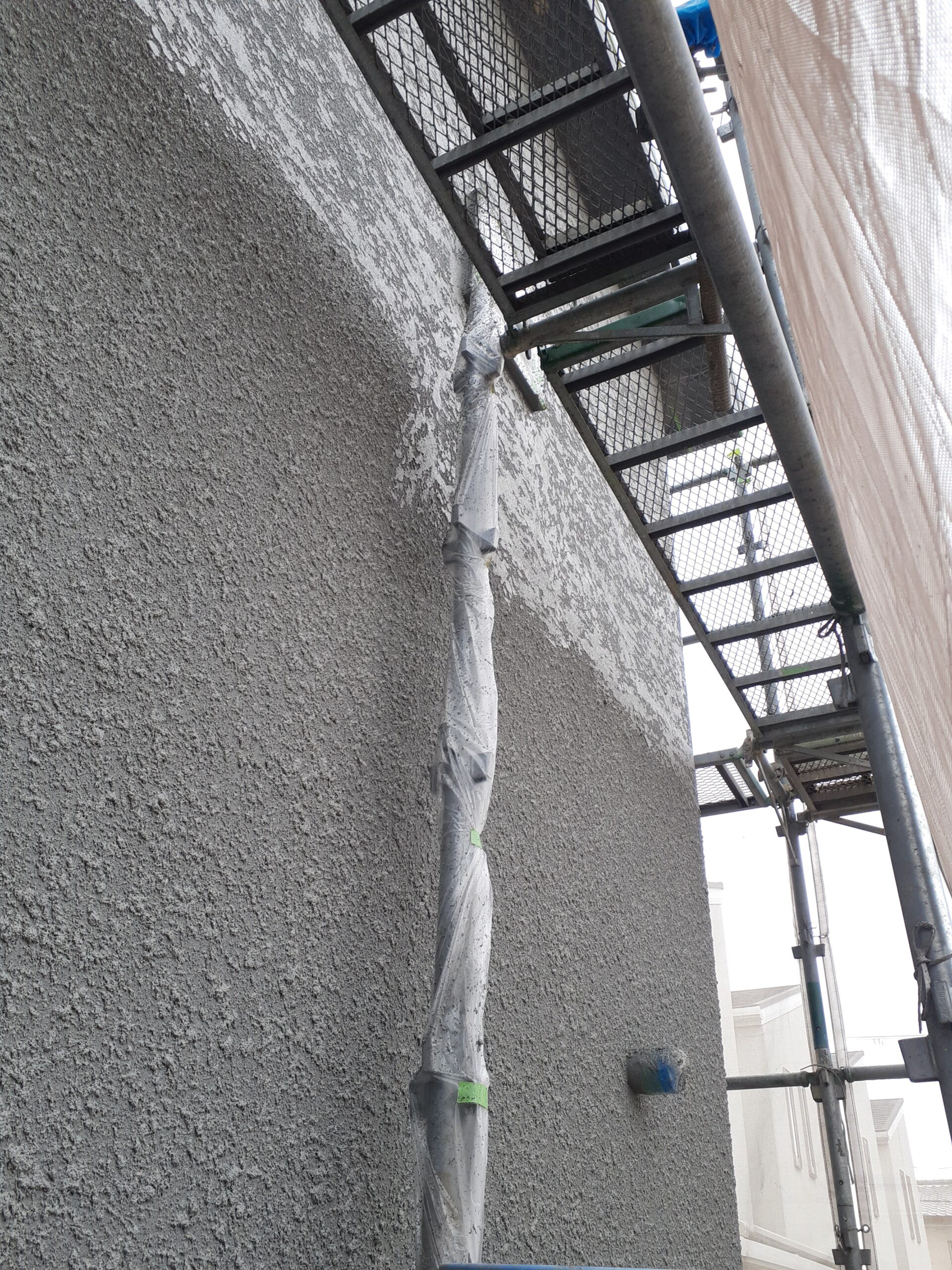 写真の上半分がコテで仕上げた部分で、下半分が塗装屋さんがネタを吹付けた所です。