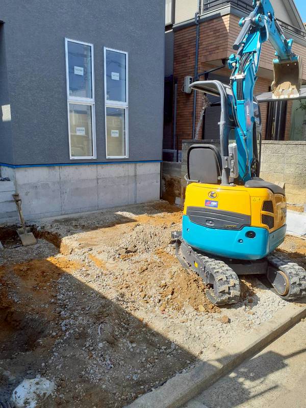 まずは掘削をして、基礎のベースになる部分に砕石を巻いてしっかり転圧していきます。