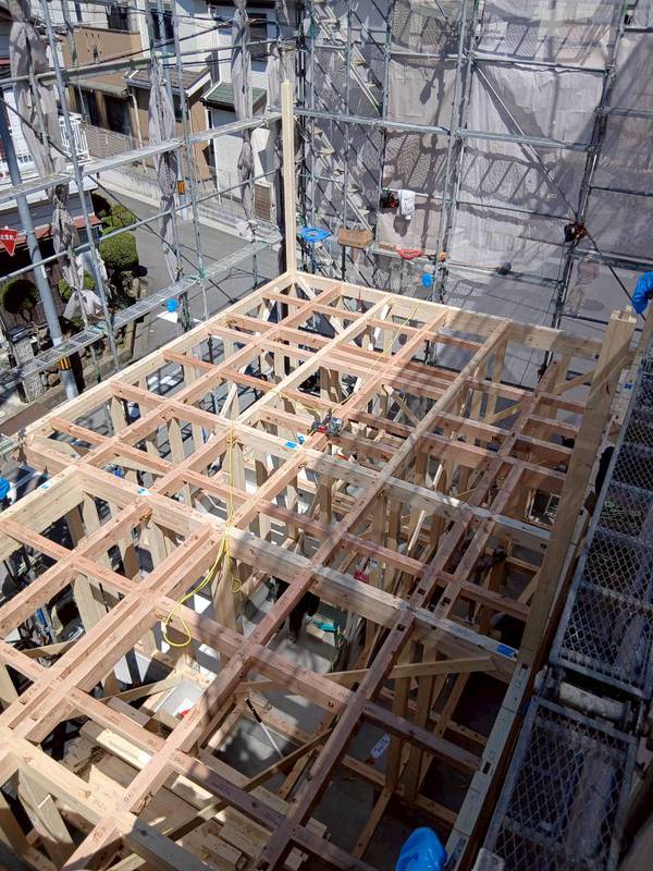 まずは1階の管柱や通し柱を建てて、横架材を組んで金物で接合していきます。