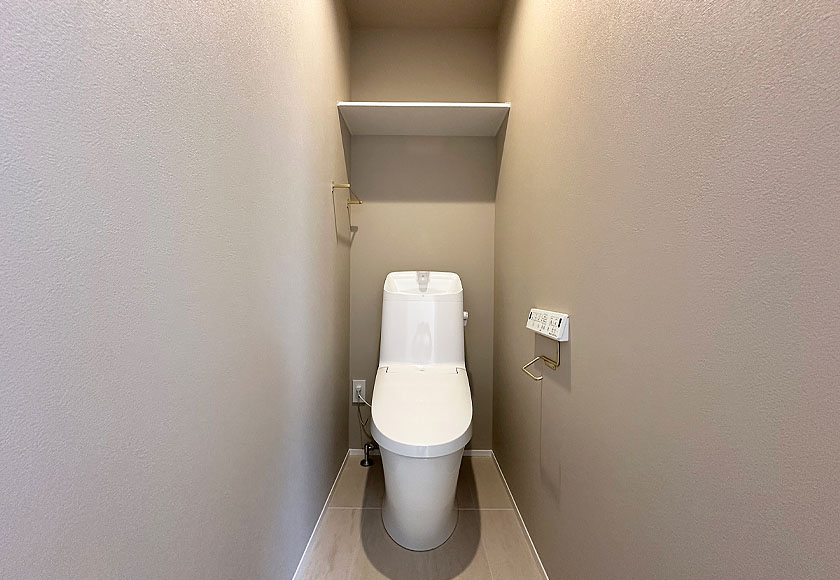 《 2階・トイレ 》タオル掛けやペーパーホルダーはモダンなゴールド。