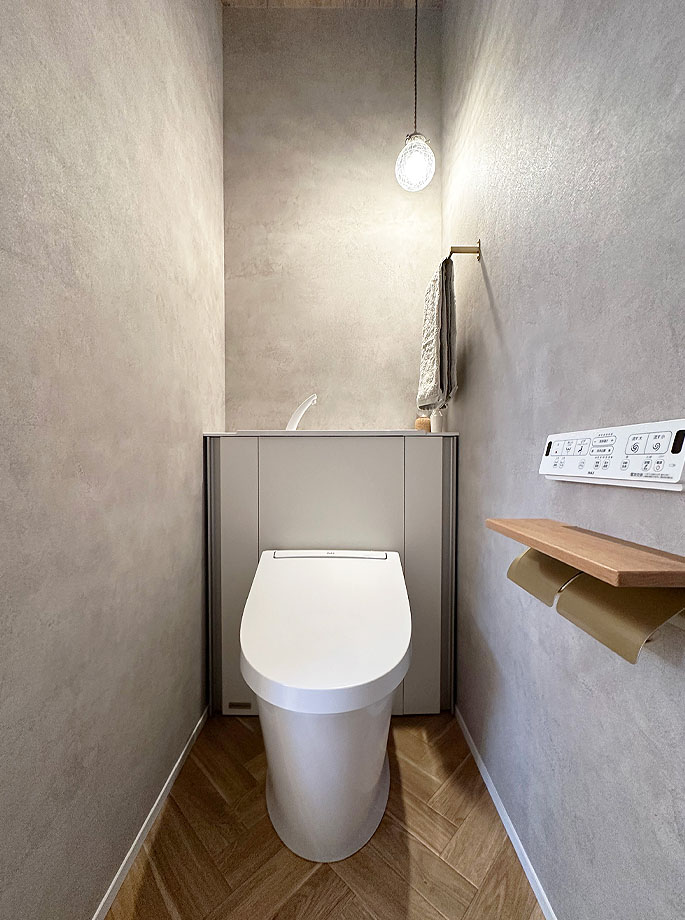 《 1階トイレ 》天井には木目を採用、床材はヘリンボーン柄。