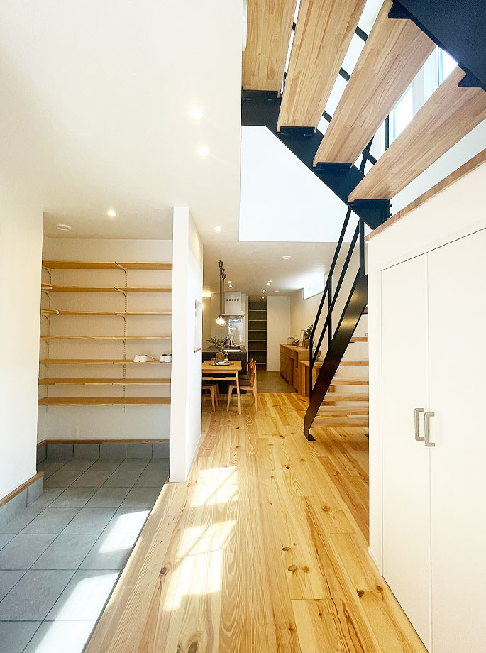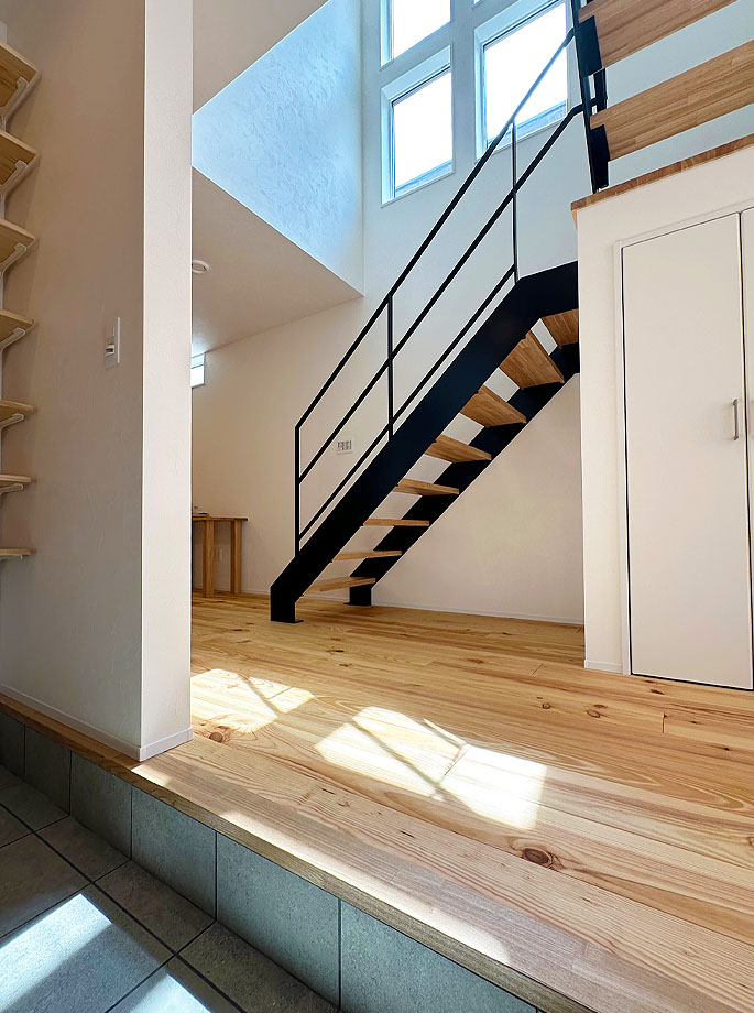 《 玄関② 》玄関を入るとすぐ鉄骨階段が大人かっこいい。その隙間をぬって、吹き抜けから降り注ぐ日差しがたっぷり◎